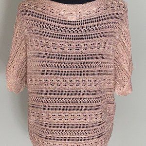 Gold colored top in excellent condition 65% polyester 35% metal yarn flashy longer in the back .
