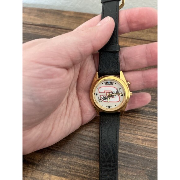 Needs new battery. This unisex wristwatch features a gold tone bezel and case with black leather strap. The dial has multicolor indices and a Dale Earnhardt signature. The watch is powered by a quartz movement and has a backlight feature. It is water resistant and has a snap caseback. The watch is styled as sport, casual, and vintage. It comes without papers and original box/packaging. The watch is made of stainless steel and base metal with a two-piece strap. The case size can be seen in the last image for detail size info.