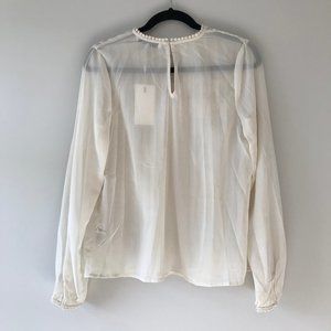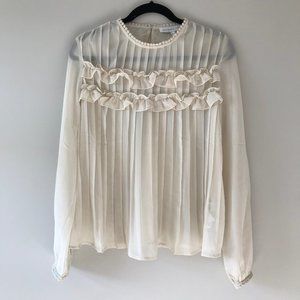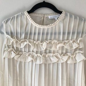 This Endless Rose blouse from Vici comes crafted in a sheer ivory fabrication. Decorated with a dual ruffle trim that lays on top of a fully pleated front. The crew neckline and button cuffed sleeves wear with a pom crochet trim. This charming blouse pairs well with a lace bandeau or cami for added coverage.