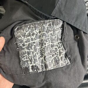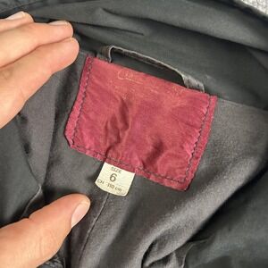 Interior: Dark lining with interior label patch; printed care/content label is very worn and cracked.
