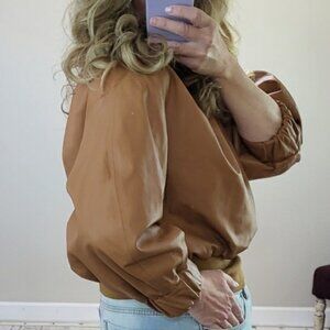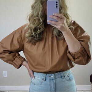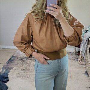 Drome Leather Three Quarter Length Sleeve Pleated Neckline Blouse Size Large