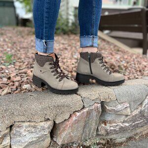 Lace-up ankle boot made with Nubuck leathers, metal lace trimmings teamed with Burel wool for a warm, cozy look and padded tongue for added comfort and style. Side zipper for easy entry and laces for extra adjustability. The laces can be opened up to accommodate a broader foot. Faux-fur lining for comfort, warmth and breathability. Featuring our chunky Dromedaris TPR outsole with contrast stitching on the welt and stacked heel effect. Kodiak Burel has our exclusive “flower power” design outsole which is anti-slip and designed to ensure traction, shock-absorption & comfort.