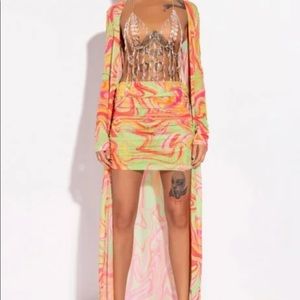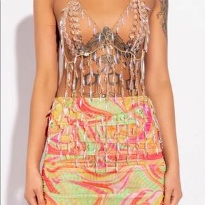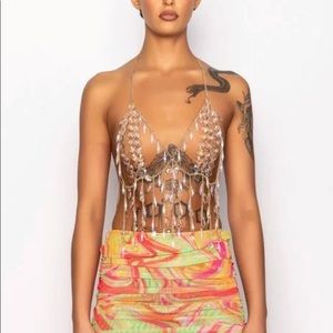 This Shimmering Bra Top features a Faux Gold Chain Link Base, Open Triangles Cup Silhouette , A Halter Neck Design and Shimmering Transparent Ab Crystal Accents. Complete Back Strap Fastening. Glam Fringe Detailing. Duel Lobster Claw Closures. New Never Worn. Comes with Gift Box.