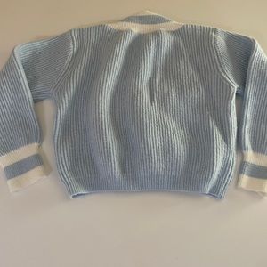One size: (fits XS/S) 65% cotton 35% Polyester. No signs of wear. Soft and comfy material. Great paired with skirts or jeans. Measurements as seen in pics