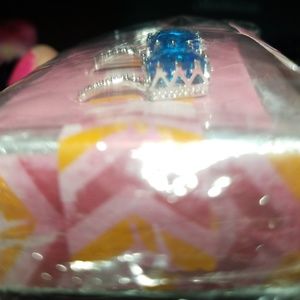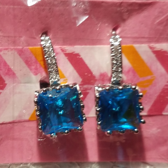 Aquamarine color sqaure cut I. White gold plated setting with small white square stones on stem. For pierced ears. Locking clasps.
