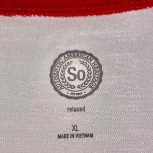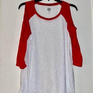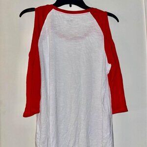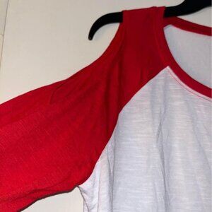 White cold shoulder (open shoulder / drop shoulder) baseball style shirt trimmed in red