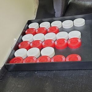A nice vintage backgammon board game. The board is in great shape. There are 13 white and 13 red chips. I believe there are supposed to be 15 of each. The box shows wear on the corners and edges as seen in the pictures.