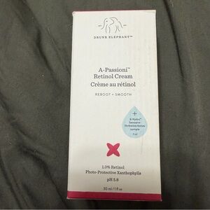 A-Passioni Retinol Cream by Drunk Elephant. Features a white box with pink and blue accents.