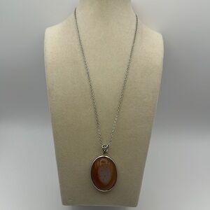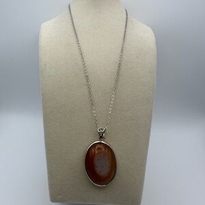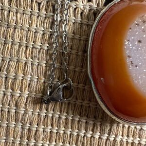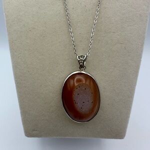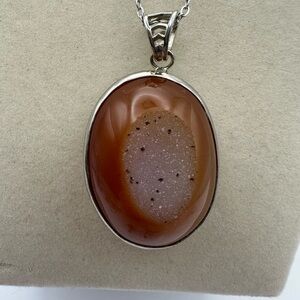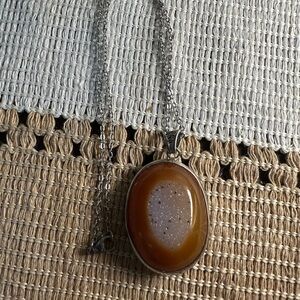 Natural druzy agate pendant on an 18” silver copper chain with lobster clasp. The pendant is an dark orangish/reddish/brown color with a white druzy in the center. It’s in a copper setting with a copper bail. It’s about 1” long and 1/2” wide. “In a spiritual context, agate is often associated with grounding, balance, and spiritual protection. It's believed to connect you to the Earth's energy, fostering a sense of peace and stability, especially during times of stress or change. Different colors of agate may have unique spiritual meanings, such as purple agate potentially deepening spiritual connection and emotional balance, or white agate associated with energy work and release.”