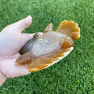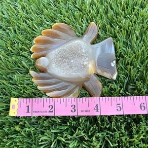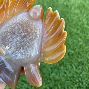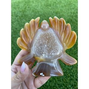 Druzy angel crystal carving. Approx 4.5” x 4” and 8.7 oz (248g). It’s hardly noticeable but one of the wing tips on one side is broken (best seen in photos 4 & 5).