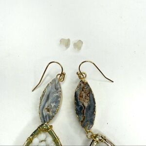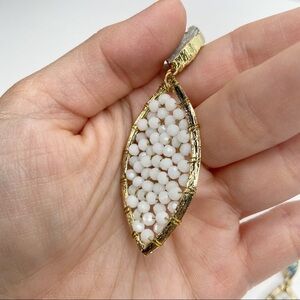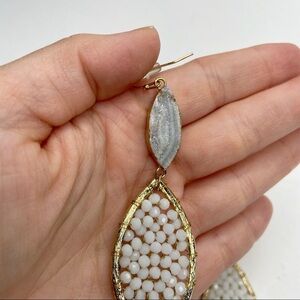 Druzy Stone White Beaded Cats Eye Drop Earrings. In gently used condition. I do believe these are genuine druzy stones; one is a greenish blue color and the other is a gray glittery color. Gold painted borders. Cat eye shaped bottom layer with small white plastic beads woven on gold wire. Hook closure with plastic backings.