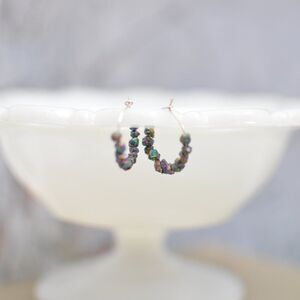 24 (12 each) Titanium plated crystal druzy nugget beads line silver hoops to create these sparkly and eye-catching earrings.