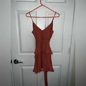 Dry Goods orange sleeveless mini dress with V-neck wrap front. Thin straps and layered ruffle skirt. Self-tie waist belt. Lightweight, flowy fabric. Versatile for day or night.