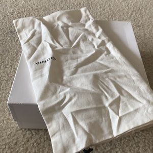Wide shaft almond toe bootie with stacked leather heel. Bag and box included