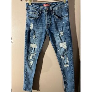 Stylish distressed blue jeans perfect for a casual look. Comfortable and trendy, these jeans are a must-have for any wardrobe.rise 9.5” inseam 26.5”
