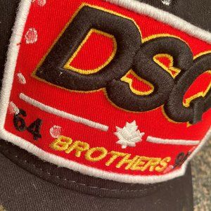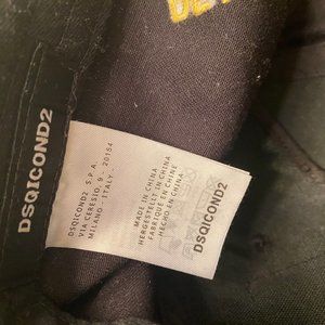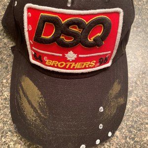 Featuring an embroidered patch to the front with 'DSQ' branding as well as a paint splatter effect and distressed look throughout. Finished off with an adjustable fastener at the back.