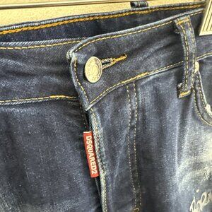 Authentic Dsquared2 jeans, Made in Italy. Slim fit with stretch. Distressed and paint splatter design, leather back patch reads “Born in Canada, Made in Italy.” Size tag 48 EU (≈ US 32). Model DSQ Slim, style 72183.