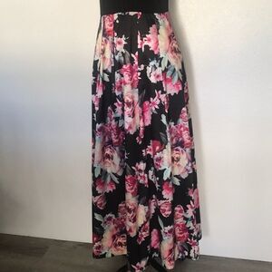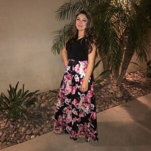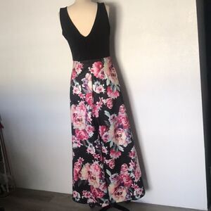 Excellent condition used once for couple hrs only very pretty long floral dress has inside slip measurements taken laying flat top part of shoulder to bottom hem is 59"