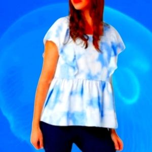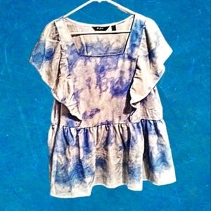 Du Jour Large Blue And White Tie Dye Ruffled Neckline Swing Hem Blouse NWOT