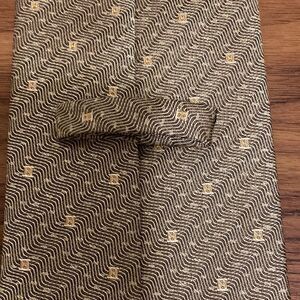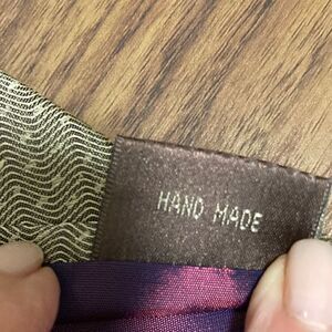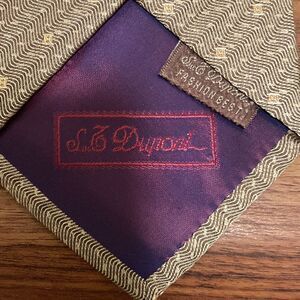 DuPont handmade woven pure silk tie in green with gold micro print. Matching keeper. Lined in purple silk with ST DuPont logo.