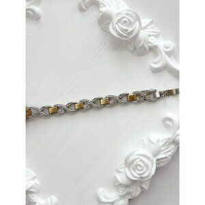 Gorgeous dual silver and gold toned vintage watch. The watch features a white face with a gold bezel and a silver toned vase. The crown is gold toned.