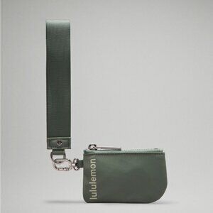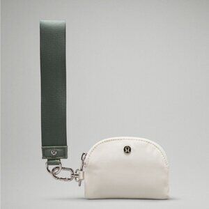 Think keys, phone, Dual Pouch Wristlet. This version has a larger pouch that doubles as a wallet, and a smaller pouch for your earbuds, chapstick, and coins. Color is Grey Eucalyptus/Bone.