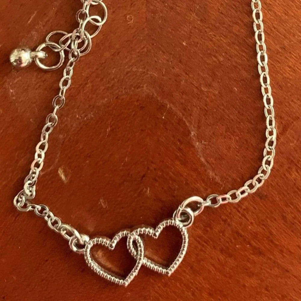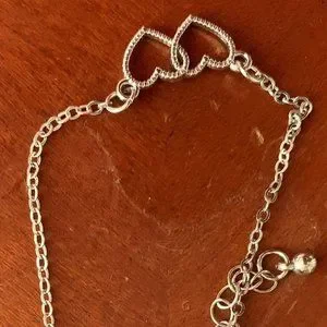 This bracelet is a dual silver rhinestone hearts with clasp closure. This bracelet is brand new.
