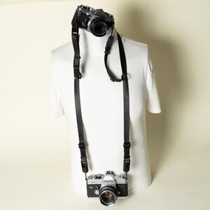 Handcrafted in my living room—not dropshipped or factory-made. This two-tier setup features grommets near the neck for connecting extra straps or mounting a second lightweight camera. Perfect for hybrid shooters, event photographers, or travelers who need versatility without bulk. The additional points also double as chest stabilizers for camera bags.