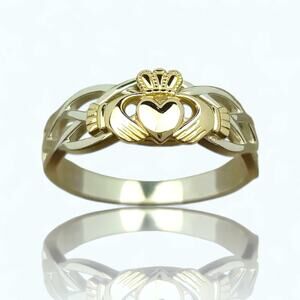 The Claddagh's heart represents love, the hands symbolize friendship, and the crown denotes loyalty - all beautifully enhanced by the flowing Celtic knot design that represents eternity and interconnection.