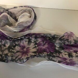 Dual White Sheer Lightweight Scarf with Purple Gray Floral 10x92 in Versatile