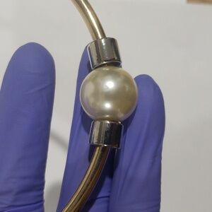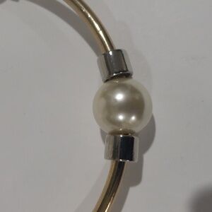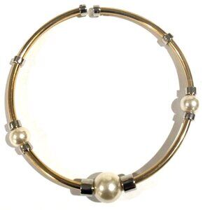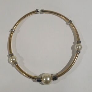 An elegant gold-tone collar necklace features three polished pearl accents and silver-tone detailing. It is a sophisticated addition to women’s fashion jewelry collections and is perfect for formal or casual wear.