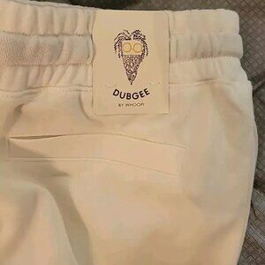 These Dubgee by Whoopi branded jogger sweatpants are perfect for any casual occasion. The white pants are made from a breathable material and have a drawstring closure for a comfortable fit. The lace-up accents and straight leg style add a sporty touch to the pants.