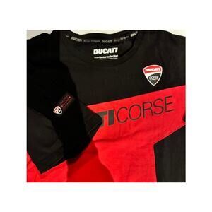 Authentic Ducati Corse Sportswear Collection tee in a bold red/black racing colorblock design. Features the official Ducati Corse shield logo on the chest and sleeve. High-quality cotton with a sharp motorsport aesthetic.