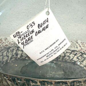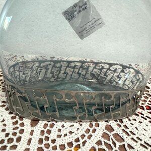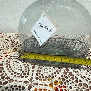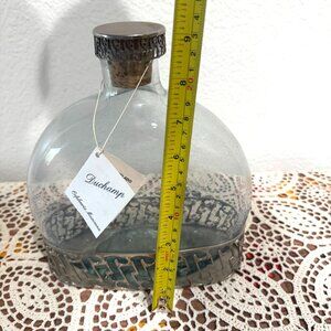 Step into a tale of elegance with this vintage glass decanter by Duchamp. Its nickel plated trim evokes timeless sophistication, while the cork lid seals in its charm. Display it as a centerpiece or use it for cherished keepsakes, each glance a journey into refined artistry.