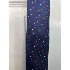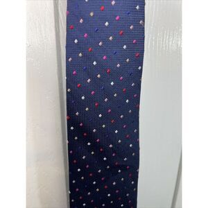 Navy tie with red, orange, white, pink, gold and blue squares. Very nice tie!! Super sharp!