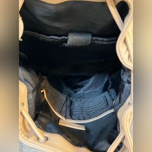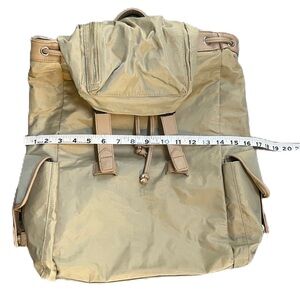 ♥️ Lightweight nylon backpack with leather-trimmed straps. Drawstring and flap top for secure closure. Exterior side pockets for extra storage. Nice, versatile tan shade for everyday use.