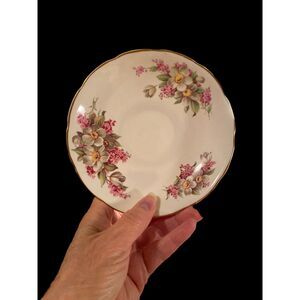 Beautiful spring flowers in yellow, cream and pink adorn this gorgeous bone china cup and saucer made by Duchess, finished with gold trim. A vintage 50's product of England. Gently used, with no stains, cracks, chips or crazing.