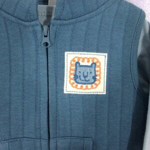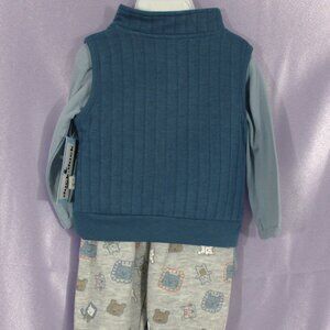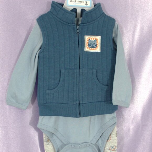 Adorable Duck Duck Goose baby 3-piece outfit set featuring a quilted zip-front vest, long-sleeve bodysuit, and matching jogger pants. The vest is a soft blue with vertical quilting, front pockets, and a cute embroidered animal patch. The coordinating bodysuit is long sleeve with snap closure for easy changes, and the jogger pants feature an allover animal print with ribbed cuffs. Comfortable, cozy, and perfect for everyday wear or gifting. Brand new with tags.
