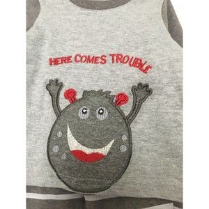 Duck Duck Goose Here Comes Trouble Baby Boy's 2 Pc Set Shirt Pants Outfit Sz 6/9M new with tag. The hangers will not be shipped with this set.