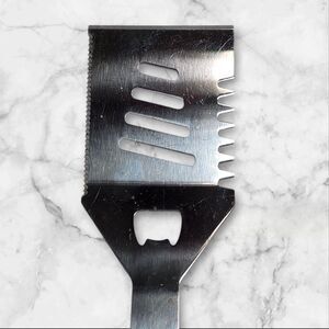 Approx 17" long stainless steel with serrated edge, slotted turner & built-in bottle opener