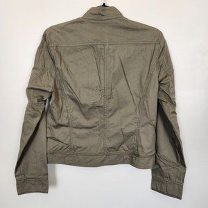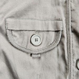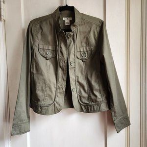 Lightweight olive green khaki type jacket from Duck Head. Flap jacket style look in size medium with decorative trim around down the sides of the buttons and around hem. Perfect for layering.