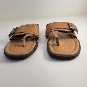 Duckhead tan leather flip flop style 1/2" heel slip on sandals has minor damage as shown in picture otherwise in great condition