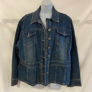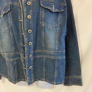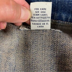 Denim jacket by Duck Head has a distressed look and a feminine style. All the buttons have the Duck Head logo. Jacket also had two breast pockets. Jacket is used but in excellent condition with no stains or rips.