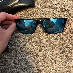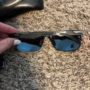Stylish Duco sunglasses with reflective blue lenses. Comes with a black case wipe and tool