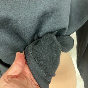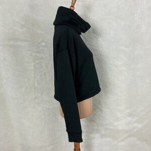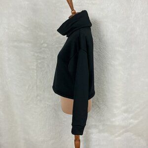 This is a black, long sleeve, oversized turtleneck neckline, crop top pullover sweatshirt or sweater from Dudley Stephens. NWT, bnwt, brand new with tags. No flaws. Polyester, spandex stretch jersey fleece recycled performance fabric. For reference the mannequin is a size 6-8 with measurements of: 34 in 26 in 35 in.
