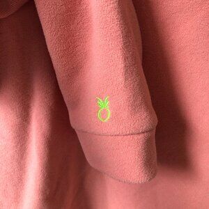 Gently used Dudley Stephens stand-up turtleneck fleece pullover in pink, size small. Park Slope style, which is hip-length. No tears or holes; one small stain on the back of the neck, as noted in the final photo. Price reflects condition.
