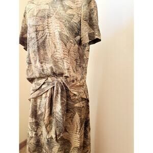 Due Per Due Silk 2 Piece Set Leaf Print Blouse Skirt Brown Beige Size 8