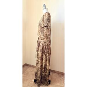 Due Per Due Collection 2-piece silk set, featuring a short sleeve blouse and a matching long skirt. Crafted from 100% pure silk, this set boasts a beautiful earthy-toned leaf print in shades of brown, beige, and taupe.