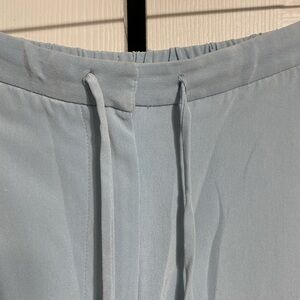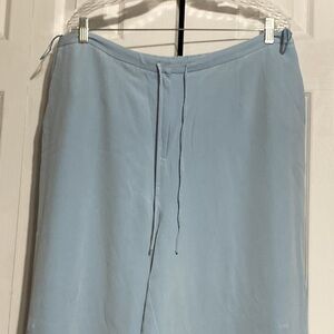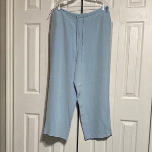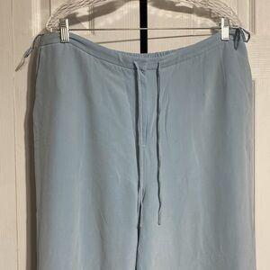 Silk lined light blue pants - have a sheen - one hook & button front zipper closure. Elastic back waist and tie front. Side pockets. Needs dry clean - One small stain on front and hanger clip marks but I do not dry clean my price reflects that. Approximate Measurements Laying flat: waist 19 1/2” stretch to 23” - rise 14” - inseam 27” - leg opening 11”. Preowned good used condition please check all pictures.