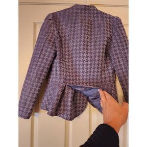 1 large button closure, poplin style cut with ruffle detail on one lapel.